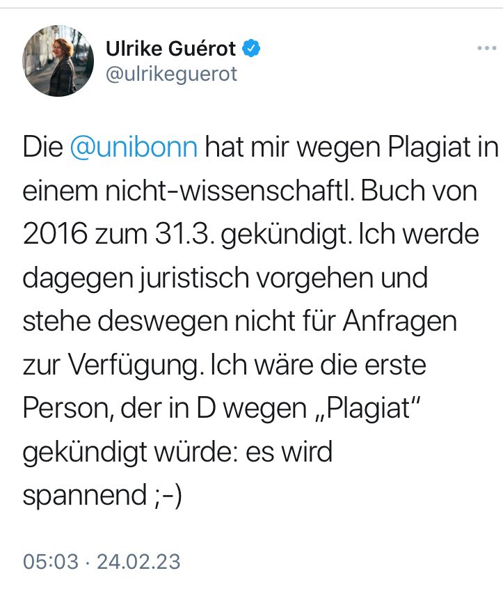 " Jetzt ist schon wieder etwas passiert. Die Universität Bonn hat ihre “streitbare” – und aufrechte – Professorin Ulrike Guérot mit 31. März 2023 gekündigt. Der Grund: vorgebliche „Plagiate“ in nichtwissenschaftlichen Publikationen.