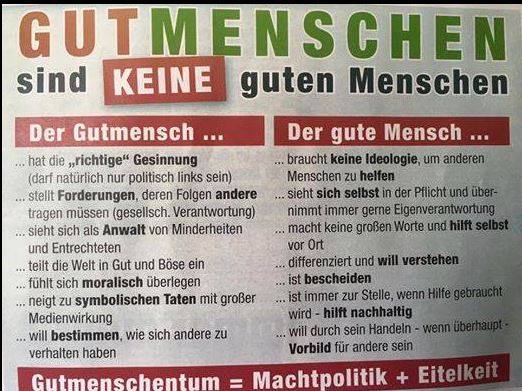 Gutmenschen sind bei genauer Betrachtung -fast ausnahmslos- daran interessiert, sich selbst zu gefallen und dem gesellschaftlichen StatusQuo und somit dem "gängigen" Zeitgeist unwidersprochen, unalanysiert und unhinterfragt zu entsprechen.